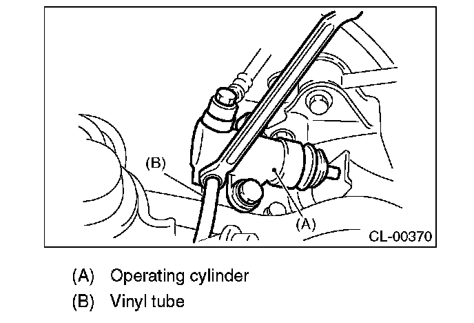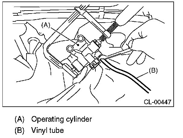 5) Fit one end of a vinyl tube into the air bleeder of the operating cylinder, and put the other end into a brake fluid container.