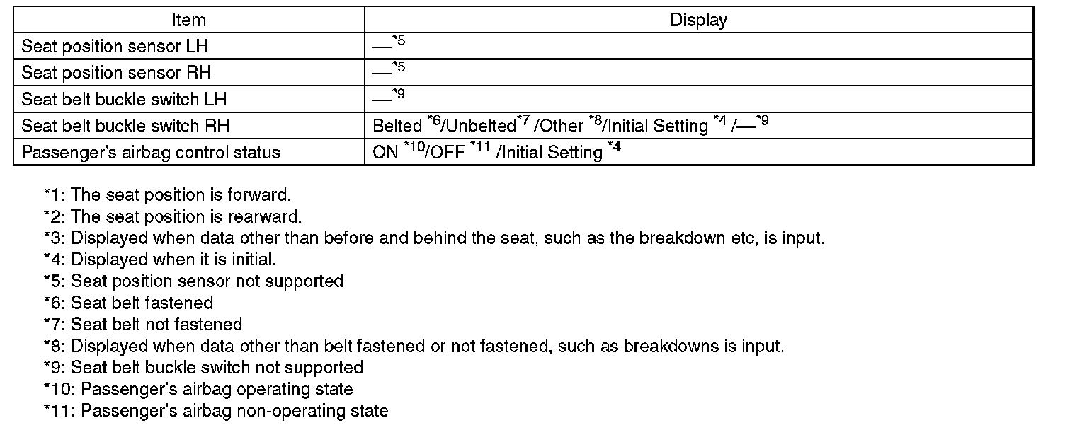 Check the operating condition of each sensor in the event of malfunction in the seat belt buckle switch, or when the seat belt buckle switch has been replaced.