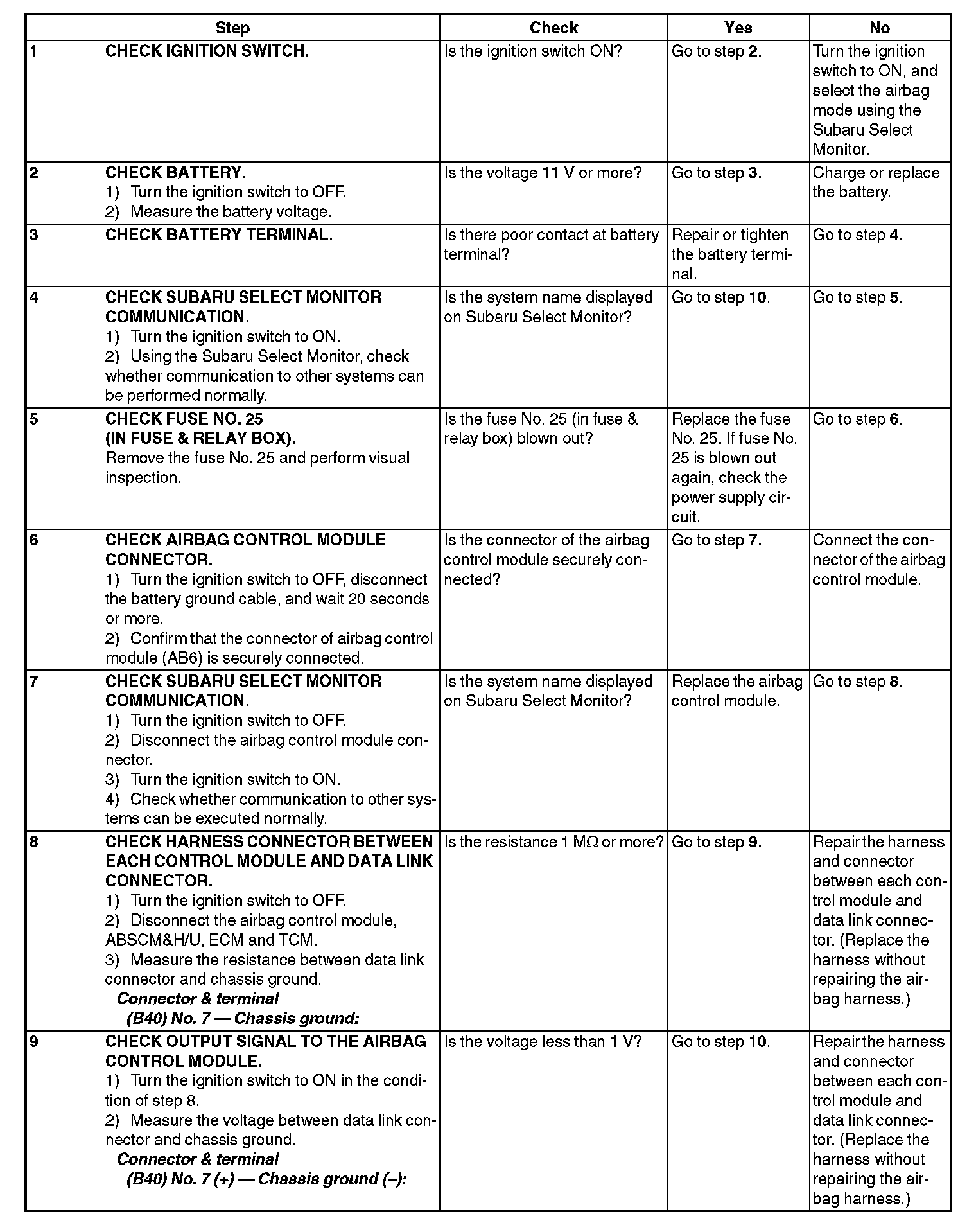 Communication is impossible between the airbag control module and the Subaru Select Monitor.