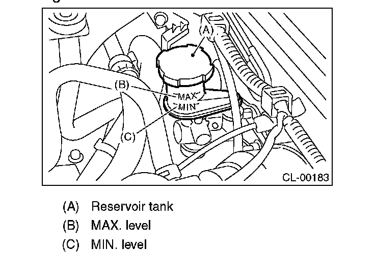 2) Inspect the fluid level using the scale on the outside of the reservoir tank. If the level is below "MIN", add fluid to bring it up to "MAX", and also inspect for leakage.