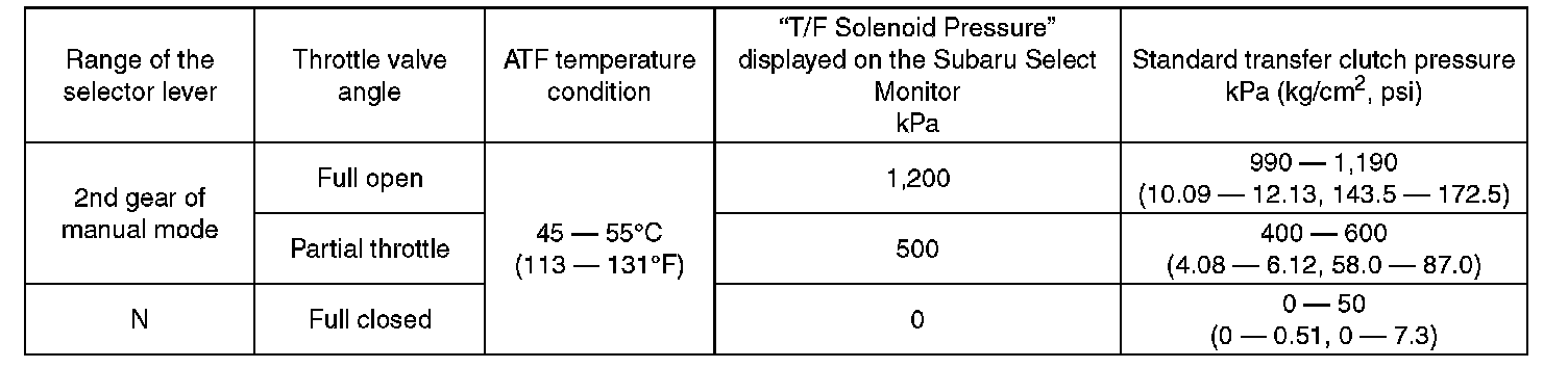 ^ After performing the transfer clutch pressure test, be sure to cool down the engine for at least one minute with the select lever set in the "P" or "N" range, and at an idle speed of 1,200 rpm or less.