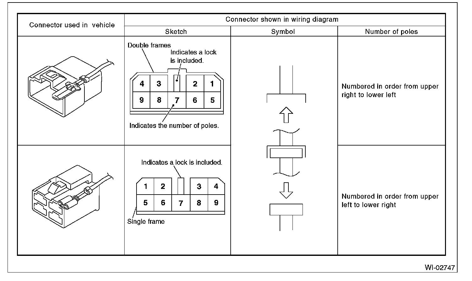 - The number of poles or pins, presence of a lock are indicated in the sketch of each connector. In the sketch, the highest pole number refers to the number of poles which the connector has. For example, the sketch of the connector shown in figure indicates the connector has 9 poles.