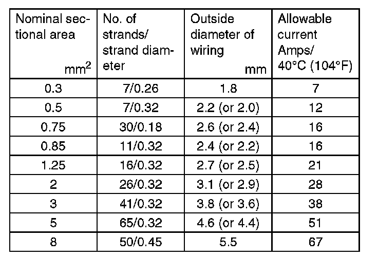 - The table lists the nominal sectional areas and allowable currents of the wires.