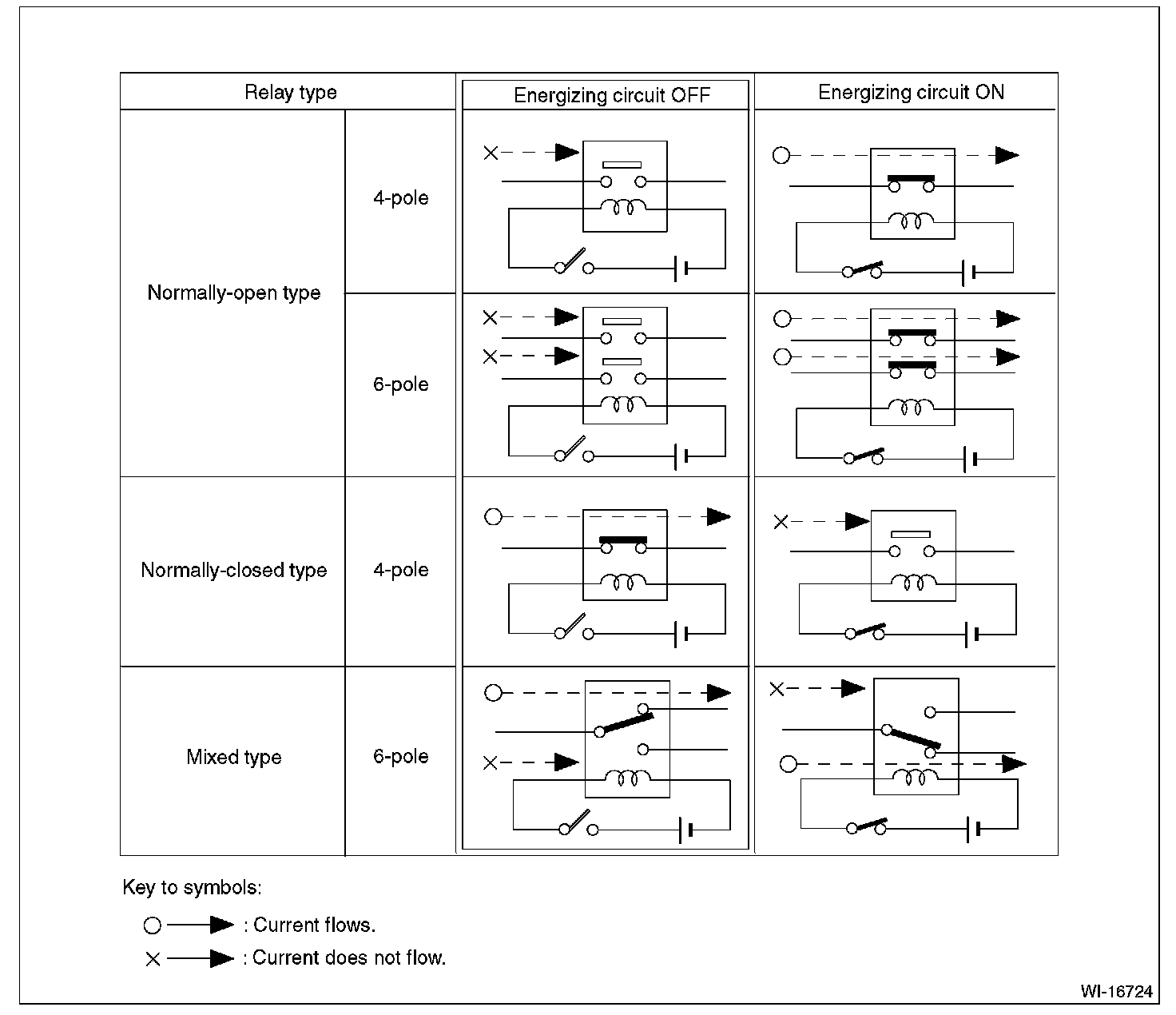 The normally-closed relay has one or more contacts. The wiring diagram shows the relay mode when the energizing circuit is OFF.