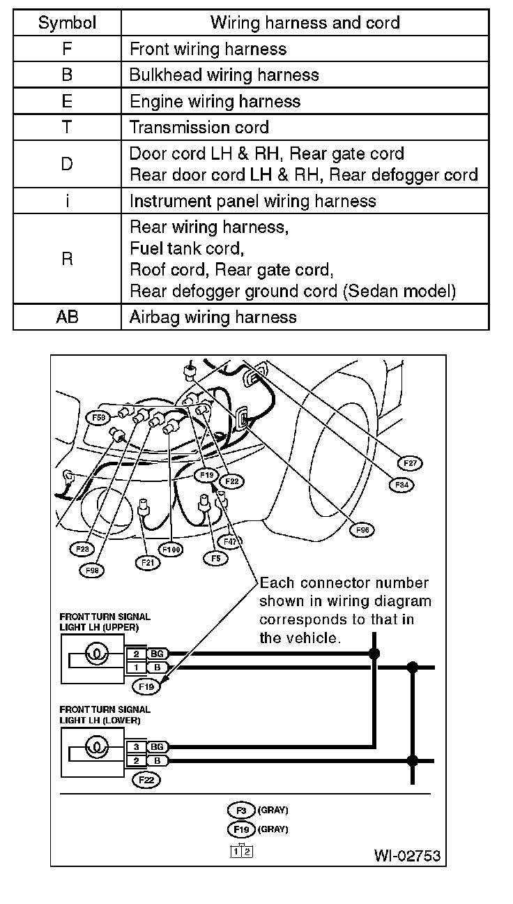 - Each connector number shown in the wiring diagram corresponds to that in the wiring harness. The location of each connector in the actual vehicle is determined by reading the first character of the connector (for example, a "F" for F8, "i" for i16, etc.) and the type of wiring harness. The first character of each connector number corresponds to the area or system of the vehicle.