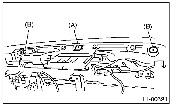 1. Insert the matching pins (three places) on the instrument panel tip into the grommet (A) and (B) on the body panel side.