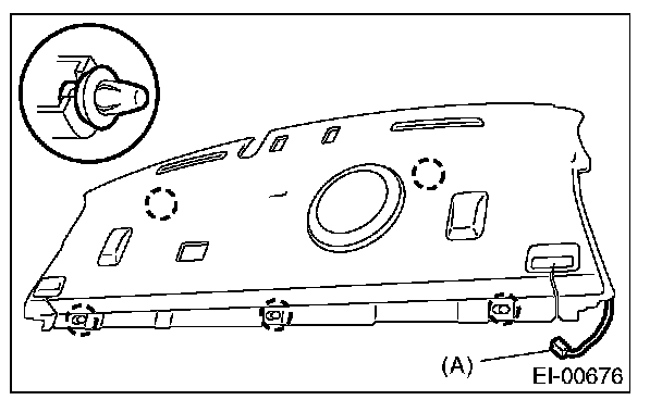 6. After disconnecting the high-mounted stop light harness connector (A) and removing the five clips, remove the rear shelf trim by pulling it frontward.
