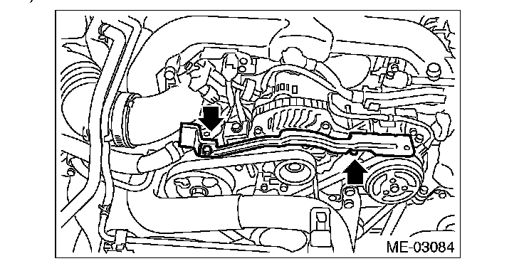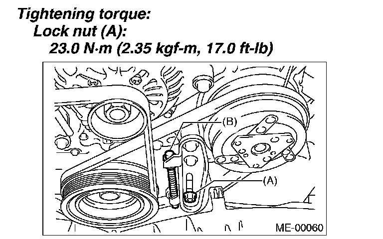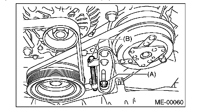 2) Install the rear side belt, and tighten the slider bolt (B) so as to obtain the specified belt tension.