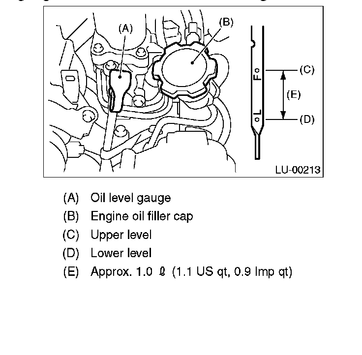 4) Remove the oil level gauge again and check the reading. If the engine oil level is below "L" line, add oil to bring the level up to "F" line.