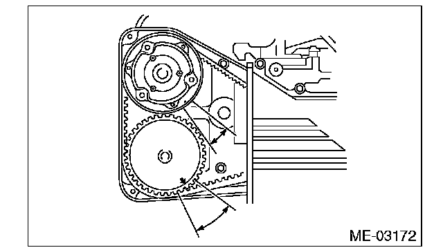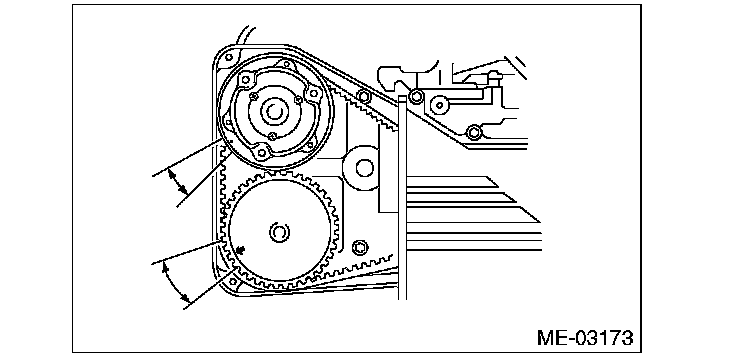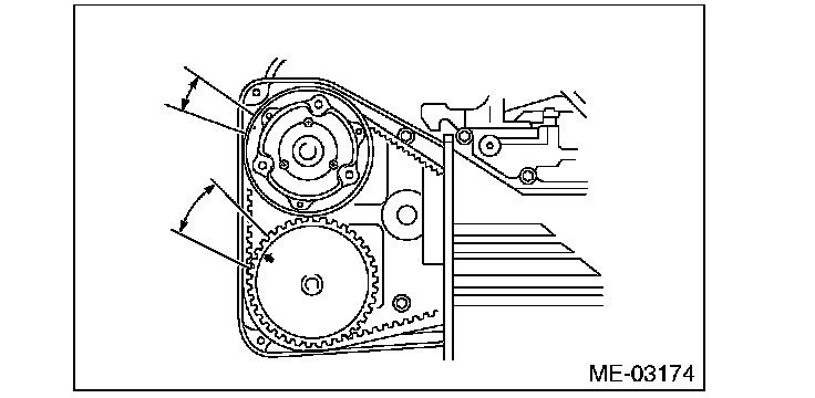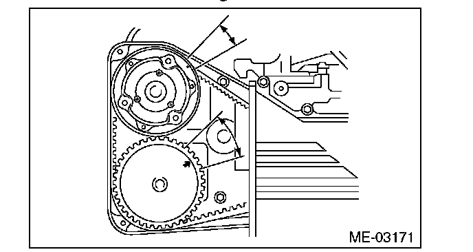 12) Turn the crank pulley clockwise until the round mark and arrow mark on the camshaft sprocket are set to position shown in the figure.