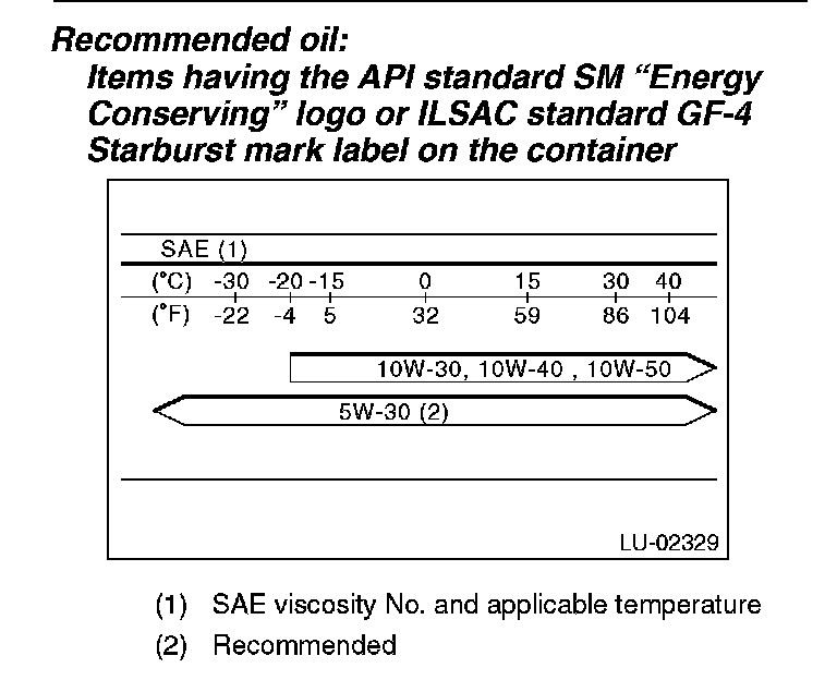 NOTE: If the vehicle is used in regions with high temperatures or in other severe environments, use oil with the viscosities shown below. API standard: SM or SL SAE Viscosity No.: 30, 40, 10W-50, 20W-40, 20W50