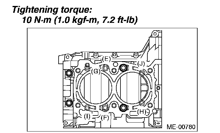 Tighten the 10 mm cylinder block connecting bolts on RH side (E - J) in alphabetical sequence.