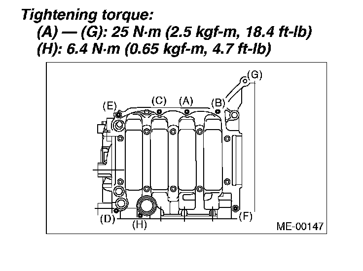 Tighten the 8 mm and 6 mm cylinder block connecting bolts on the LH side (A - H) in alphabetical order.