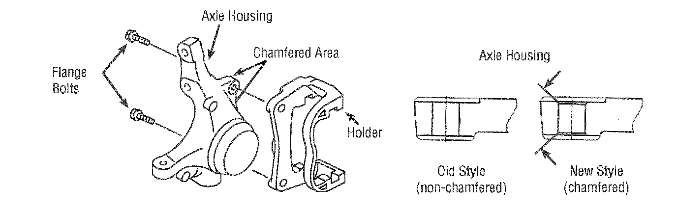 ^ The front disc brake caliper support (holder) hardware was changed from a bolt assembly (bolt and washer) to a flange bolt along with the torque specification Also, the portion of the axle housing that the flange bolt contacts has been chamfered.