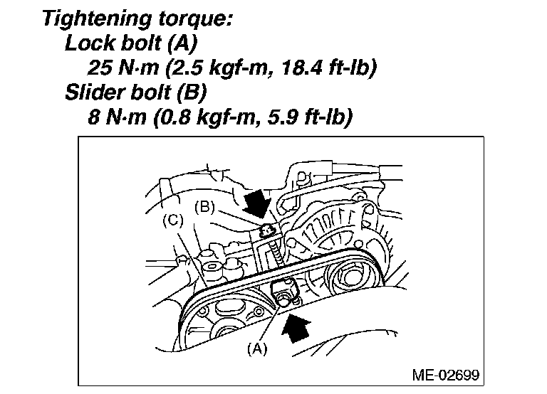 1) Install the front side belt (C), and tighten the slider bolt so as to obtain the specified belt tension.