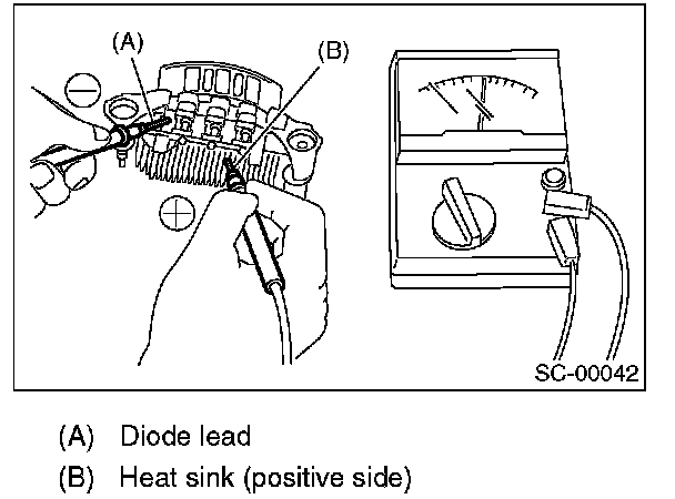 Check for continuity between the diode lead and positive side heat sink. If resistance is 1 ohm or less only in the direction from the diode lead to the heat sink, the positive diode is OK.