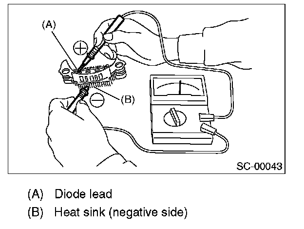 Check for continuity between the negative side heat sink and diode lead. If resistance is 1 ohm or less only in the direction from the heat sink to the diode lead, the negative diode is OK.
