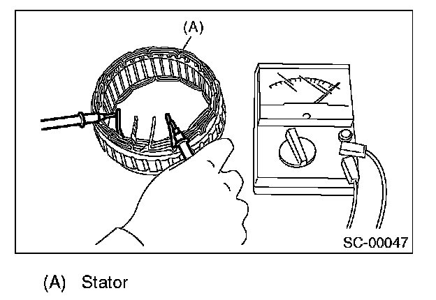 Inspect the continuity between the stator coil stator core and lead wire terminals. If the resistance is 1 ohm or less, the stator coil is grounded. Replace the stator assembly.