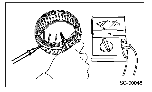 Check the continuity between slip ring and rotor core or shaft. If the resistance is 1 ohm or less, replace the rotor assembly because the rotor coil is grounded.