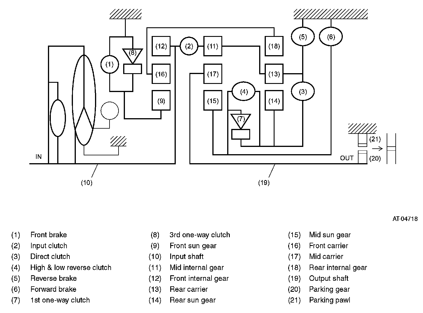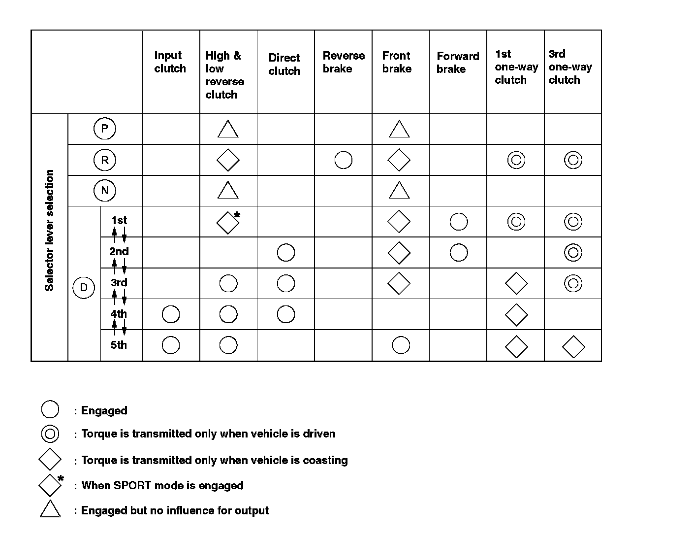 - As with N range, since both forward brake and reverse brake are in the release status, driving force of input shaft is not transmitted to output shaft.