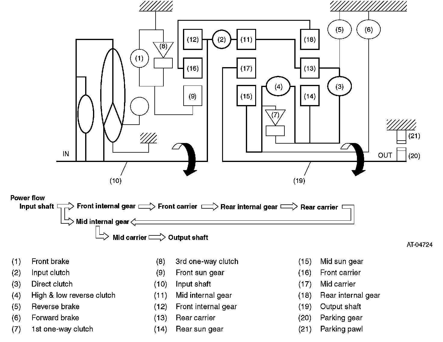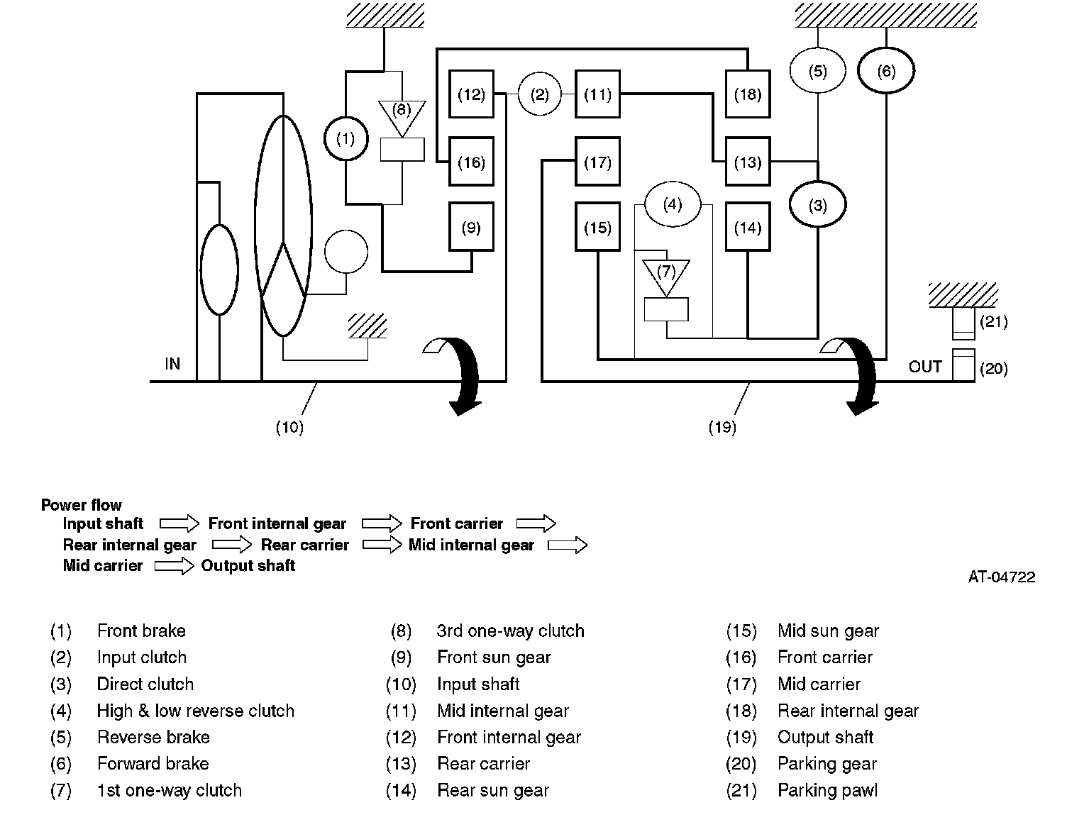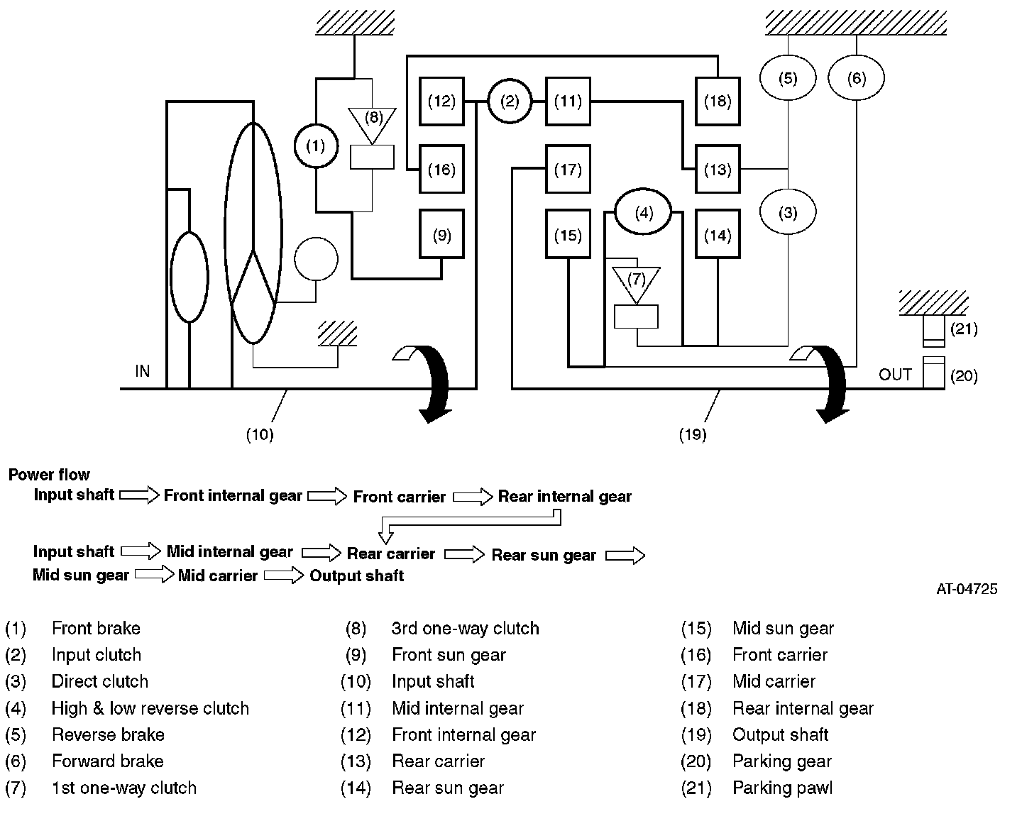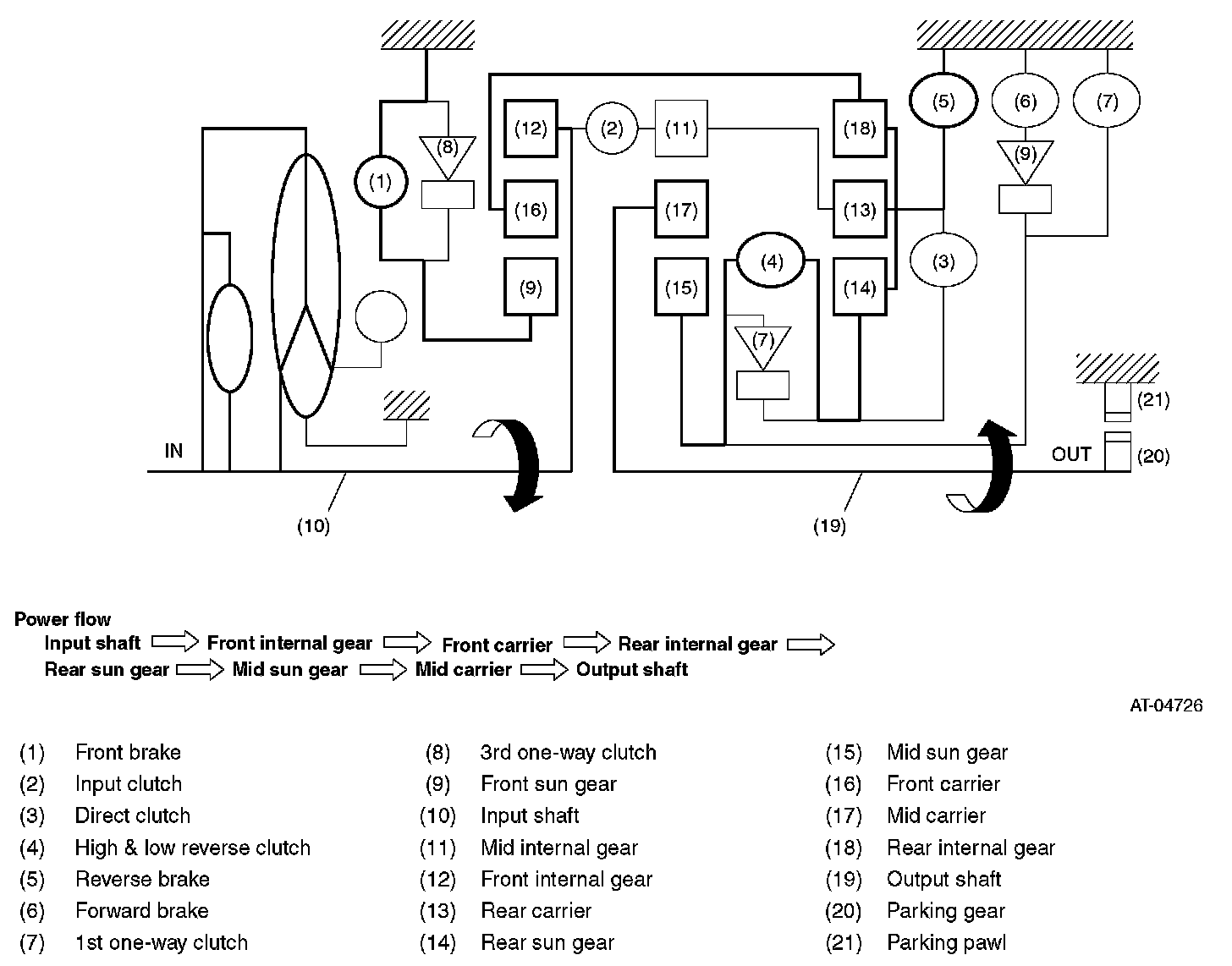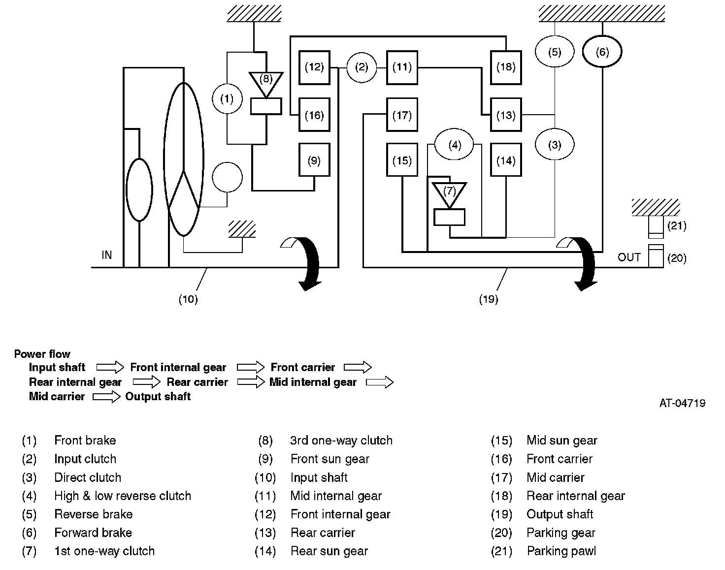- Driving force is transmitted to front internal gear, mid internal gear and rear carrier, and the three planetary gears rotate in normal direction as a unit.