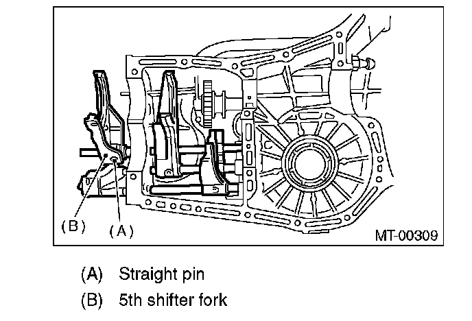 8) Drive out the straight pin by tapping with the ST, and pull out the 5th shifter fork.