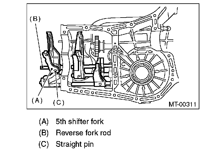8) Install the 5th shifter fork onto the rear of reverse fork rod. Align the holes in the two parts and drive new straight pin into the specified place.