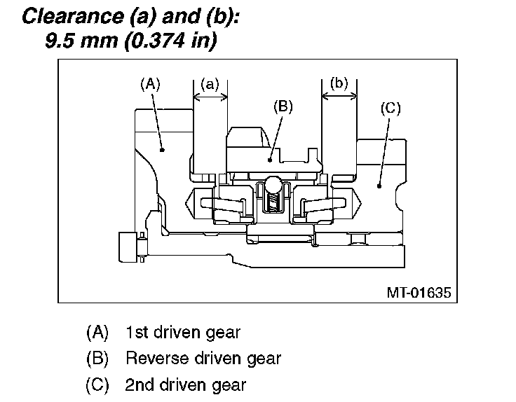 3) Inspect the clearance between 1st, 2nd driven gear and reverse driven gear. If any clearance is not within specifications, replace the shifter fork as required.