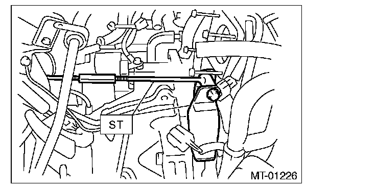 27) Tighten the turnbuckle of the ST while lowering the transmission jack to tilt the engine assembly towards the back.
