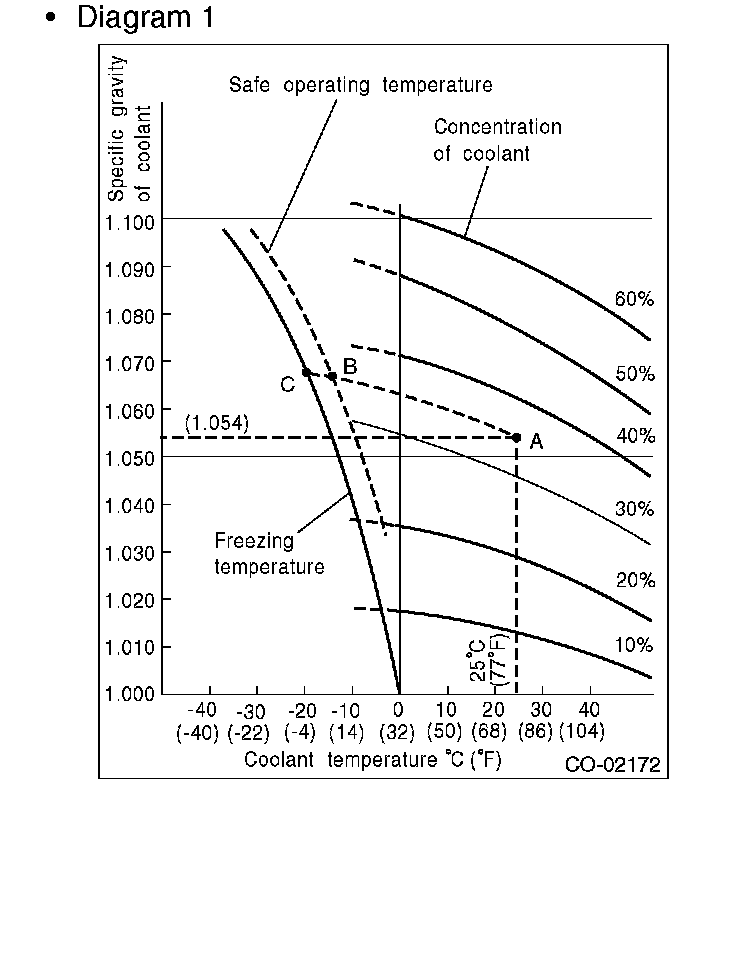 If the coolant temperature is 25°C (77°F) and its specific gravity is 1.054, the concentration is 35% (point A), the safe operating temperature is -14°C (7°F) (point B), and the freezing temperature is -20°C (-4°F) (point C).