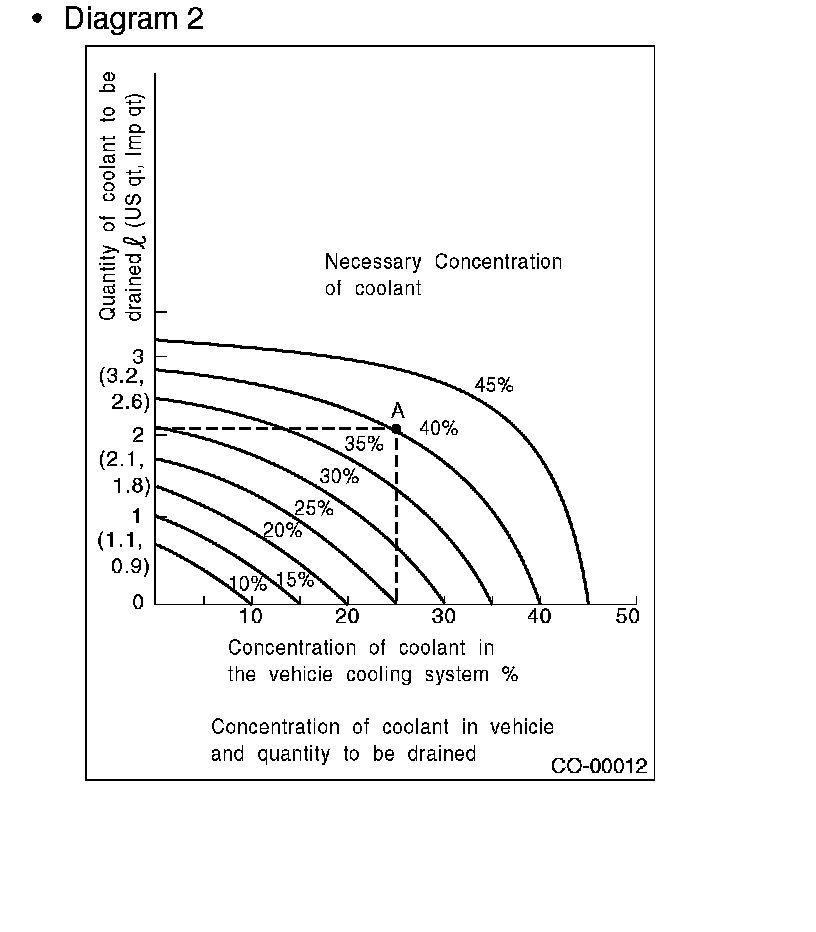 Assume that the engine coolant concentration must be increased from 25% to 40%. Find point A, where the 25% line of engine coolant concentration intersects with the 40% curve of the necessary engine coolant concentration, and read the scale on the vertical axis of the graph at height A. The quantity of coolant to be drained is 2.1 l (2.2 US qt, 1.8 Imp qt). Drain 2.1 l (2.2 US qt, 1.8 Imp qt) of coolant from the cooling system and add 2.1 l (2.2 US qt, 1.8 Imp qt) undiluted coolant solution.