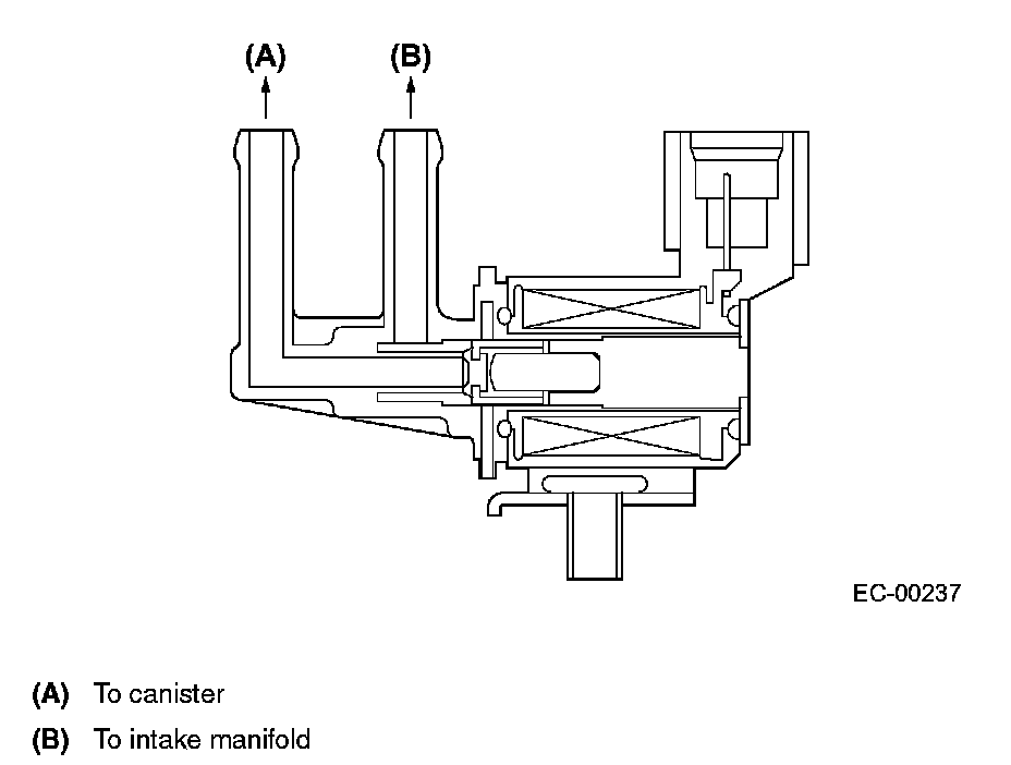 The purge control solenoid valve is on the evaporation line between the canister and intake manifold. It is installed at the underside of intake manifold.
