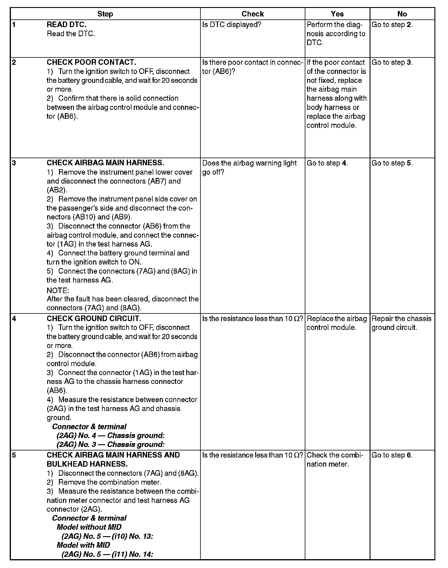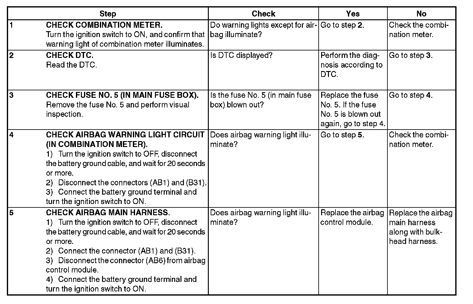 - Airbag control module to airbag warning light circuit is shorted or open.