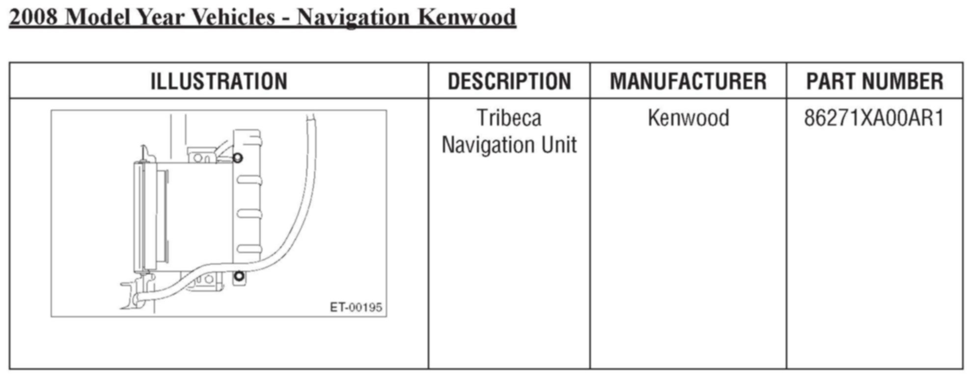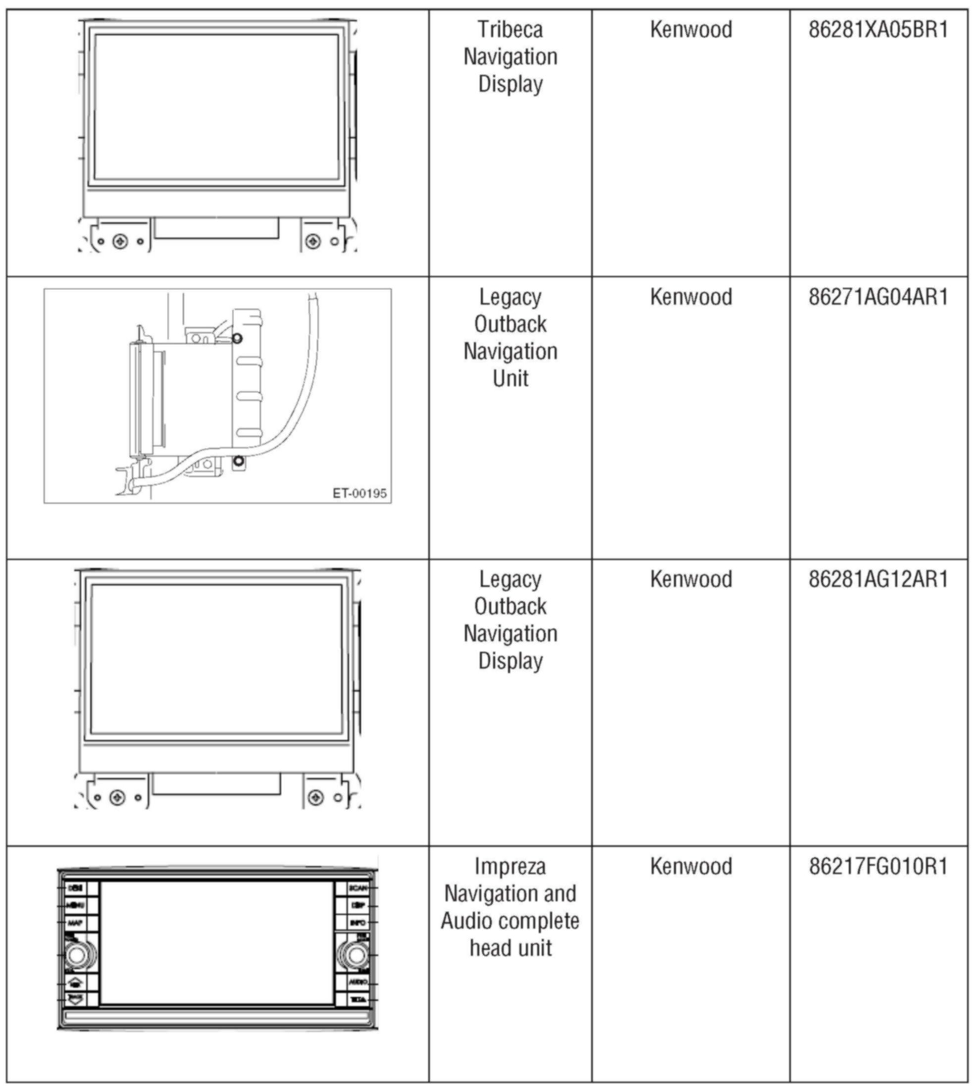 Genuine Subaru navigation systems are manufactured by Kenwood Corporation. In the event a navigation unit or display screen requires an exchange, it is not necessary to remove the unit from the vehicle. The procedures listed below must be followed: