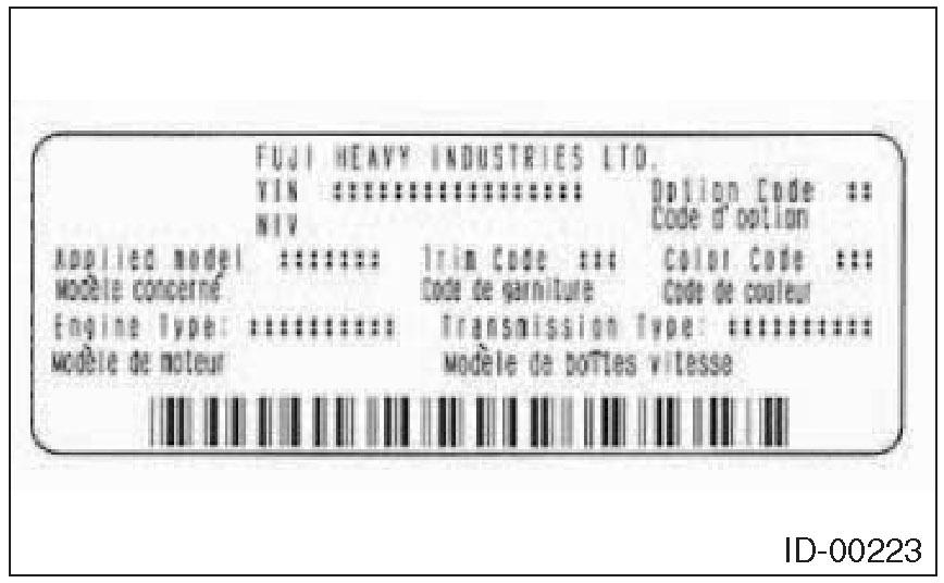The model number label indicates: the applied model, the option code, the trim code, the engine type, the transmission type, and the exterior color code. This information is helpful when placing orders for parts.
