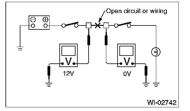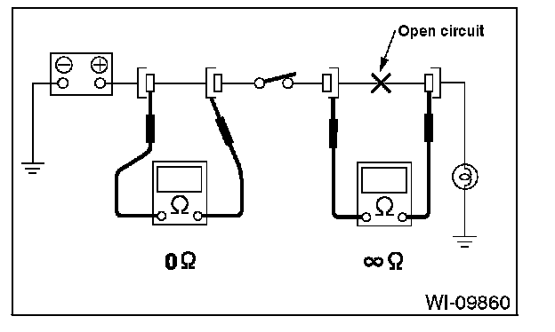 Disconnect all connectors affected, and check continuity in the wiring between adjacent connectors. When the ohmmeter indicates infinite , the wiring is open.