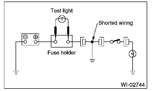 Connect a test light (rated at approx. 3 watts) in place of the blown fuse and allow current to flow through the circuit. Disconnect one connector at a time from the circuit. Starting with the one located farthest from the power supply. If the test light goes out when a connector is disconnected, the wiring between that connector and the next connector (farther from the power supply) is shorted.