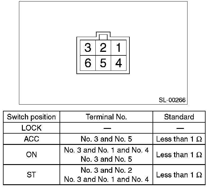 4. Turn the ignition key plate to each position and check the continuity between terminals of ignition connector.