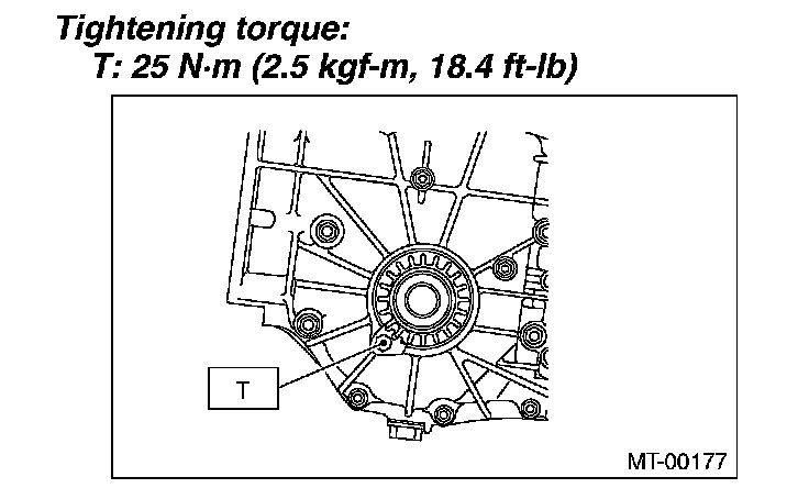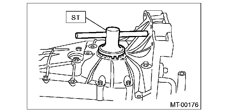 10) Screw the retainer assembly from the bottom into left case using ST2. Fit the ST3 on transmission main shaft. Shift the gear into 4th or 5th, and turn the shaft several times. Screw in the retainer while rotating the ST3 until a slight resistance is felt on ST2.