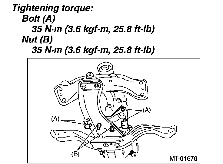 3) Install the transmission cushion rubber to the center crossmember, and tighten the nut (B).