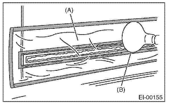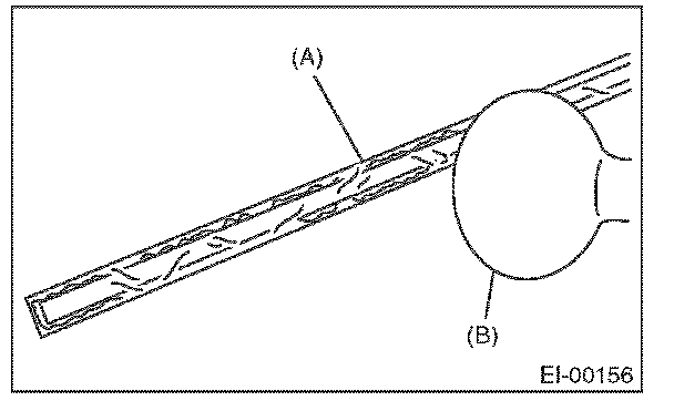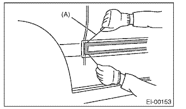 1. Insert a thin piece of string (A) of 0.8 mm (0.031 in) or less (fishing line, etc.) between the vehicle body and the door garnish.