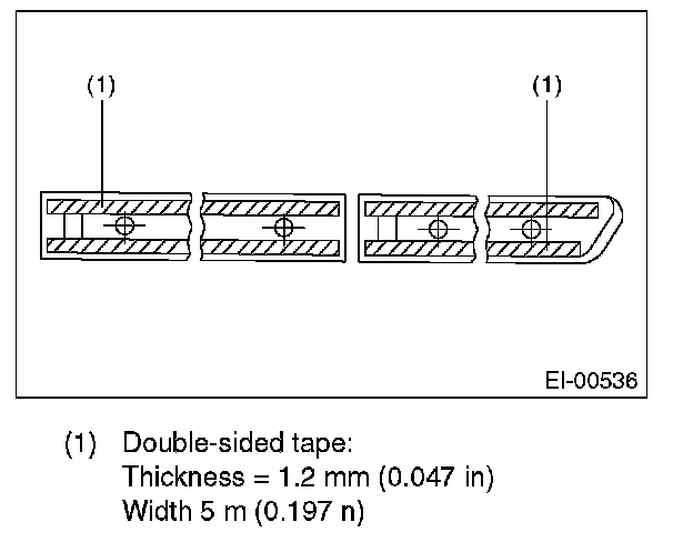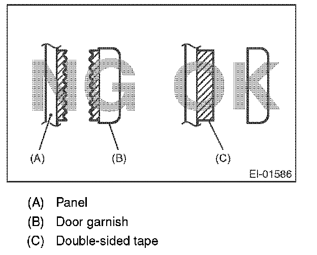 1. Apply primer to the door garnish surface where the double-sided tape is to be adhered, and then adhere the double-sided tape as shown in the figure.