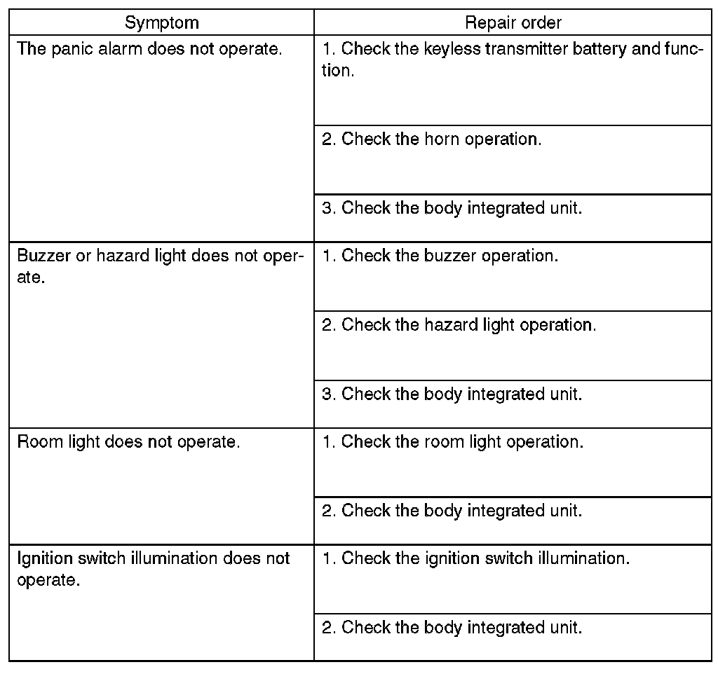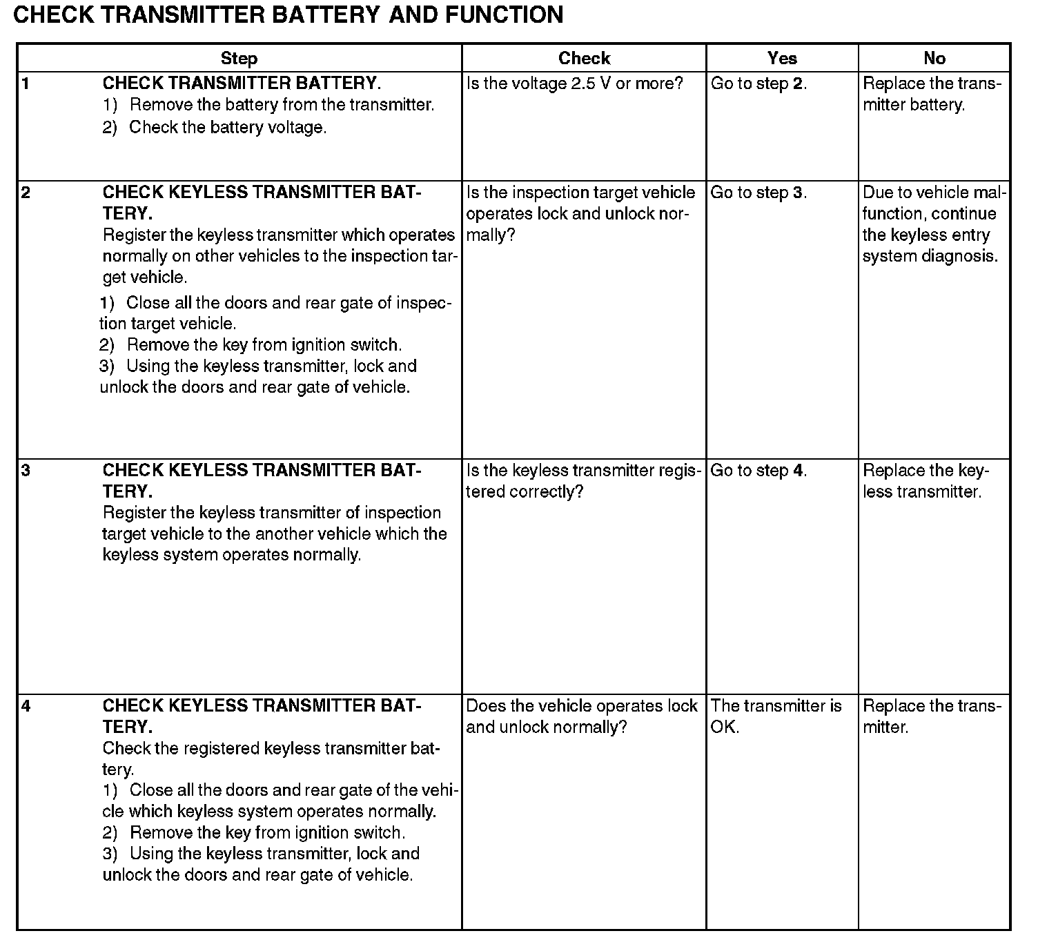 CAUTION: Be sure to reset the keyless transmitter of other vehicle which is registered to the inspection target vehicle, and the vehicle to which the keyless transmitter is registered for inspection, to the condition before performing the inspection. (Register the keyless transmitter again.)