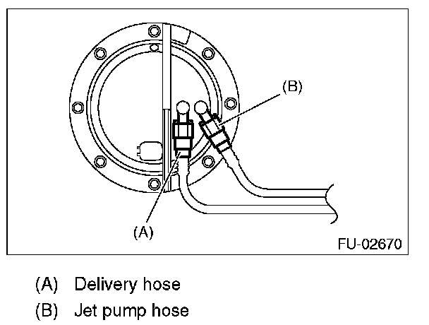 6. Disconnect the quick connector, and then disconnect the fuel delivery hose and jet pump hose.