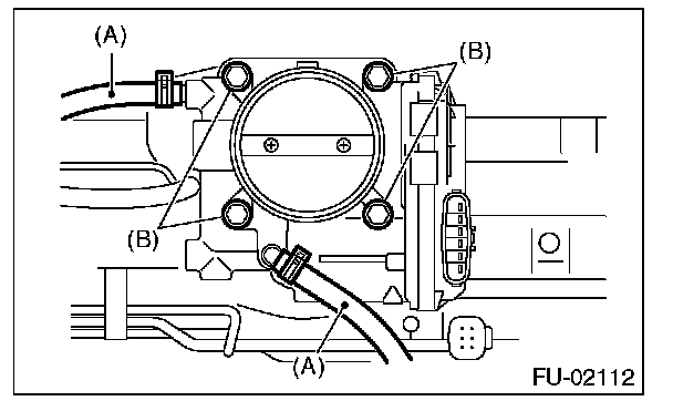 6. Remove the bolts (B) which secure throttle body to intake manifold.