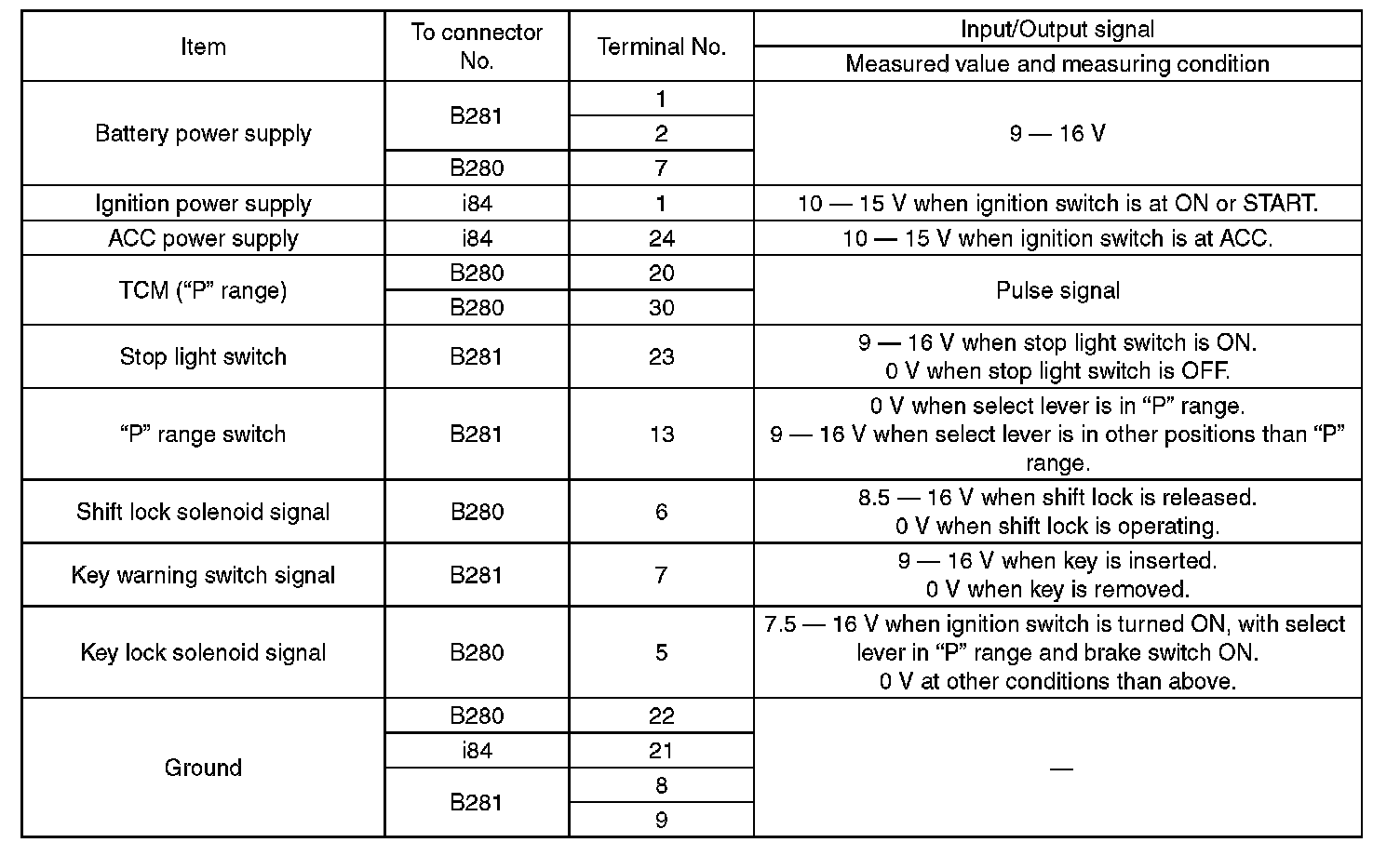 Pinout Values and Diagnostic Parameters