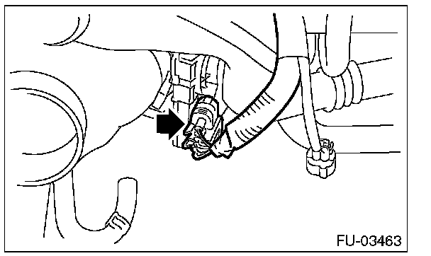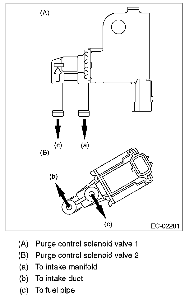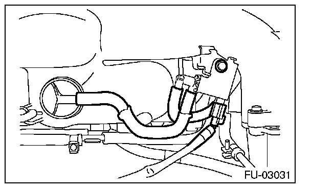 6. Disconnect the evaporation hose of the purge control solenoid valve 2 from the intake duct and fuel pipe assembly.