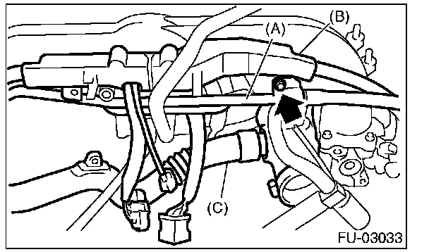 9. Install PCV pipe (A), harness assembly (B) and intake duct (C) to the intake manifold.