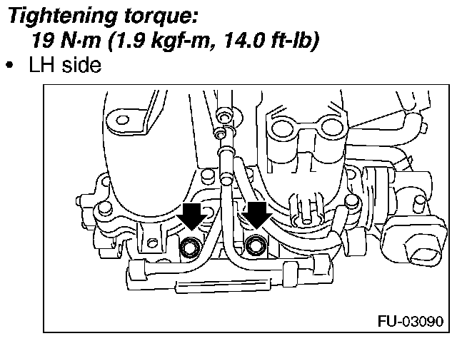 4. Tighten the bolts which secure the fuel injector pipe RH to the lower side of the intake manifold.