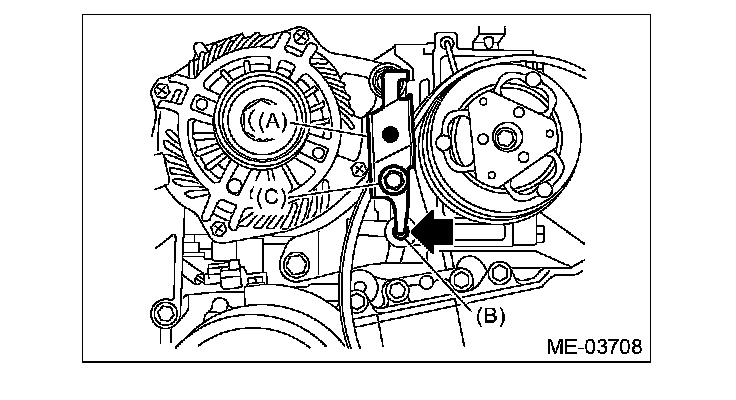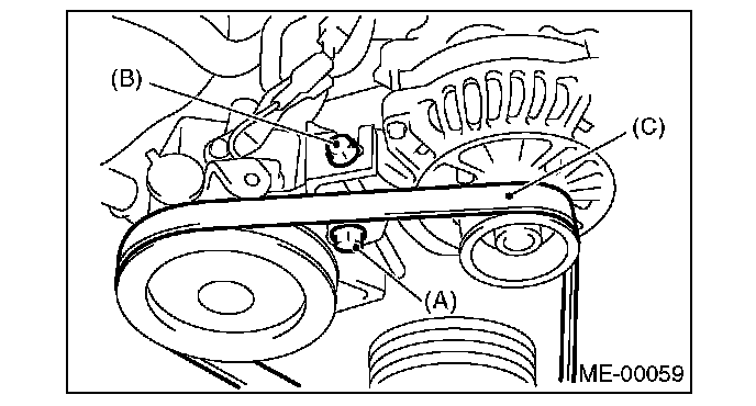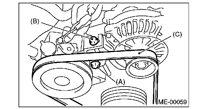 2) Install the front side belt (C), and adjust the slider bolt (B) so as to obtain the specified belt tension.